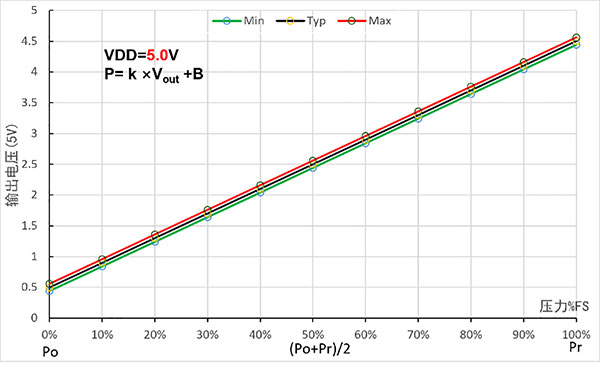 Remarque : Vout est la tension de sortie analogique (unité : V) ; P est la valeur de pression (en kPa) ; k. B représente le coefficient linéaire et le décalage, comme indiqué dans le tableau ci-dessous.